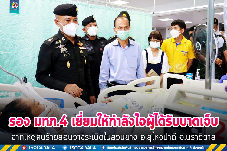 โดยการเยี่ยมกำลังพลในครั้งนี้ เป็นผู้ป่วยที่รักษาตัว ณ ตึกพิเศษชั้น 6 โรงพยาบาลสุไหงโก-ลกจำนวน 8 นาย ประกอบด้วย พันตำรวจโท วสันต์ พันธโภชน์, ร้อยตำรวจตรี ยุทธภูมิ สมานวงษ์, สิบตำรวจตรี ศุภชัย ตันติพนาทิพย์, สิบตำรวจตรี อนิรุธ เจ๊ะดอเล๊ะ, สิบตำรวจตรี ธนพล ชูชื่น, สิบตำรวจเอก ทัศนัย ตรุระจิตต์, ร้อยตำรวจเอก สถาบัน สุวรรณการณ์ และ จ่าสิบตำรวจ ภานุวัฒน์ ชมภูนุช ซึ่งขณะนี้ผู้ป่วยทุกนายอาการดีขึ้นลำดับ พร้อมกันนี้ รองแม่ทัพภาคที่ 4 และคณะฯ ได้เยี่ยมให้กำลังใจ นางประทุม นักทอง และครอบครัว ผู้ป่วยขาขาดทั้ง 2 ข้าง จากเหตุเหยียบระเบิดดังกล่าว โดยทีมแพทย์ได้รักษาและดูแลอย่างใกล้ชิด