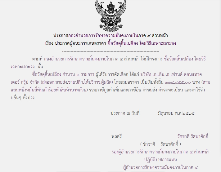 ประกาศผู้ชนะการเสนอราคา ซื้อวัสดุสิ้นเปลือง โดยวิธีเฉพาะเจาะจง