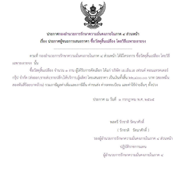 ประกาศผู้ชนะการเสนอราคา ซื้อวัสดุสิ้นเปลือง โดยวิธีเฉพาะเจาะจง
