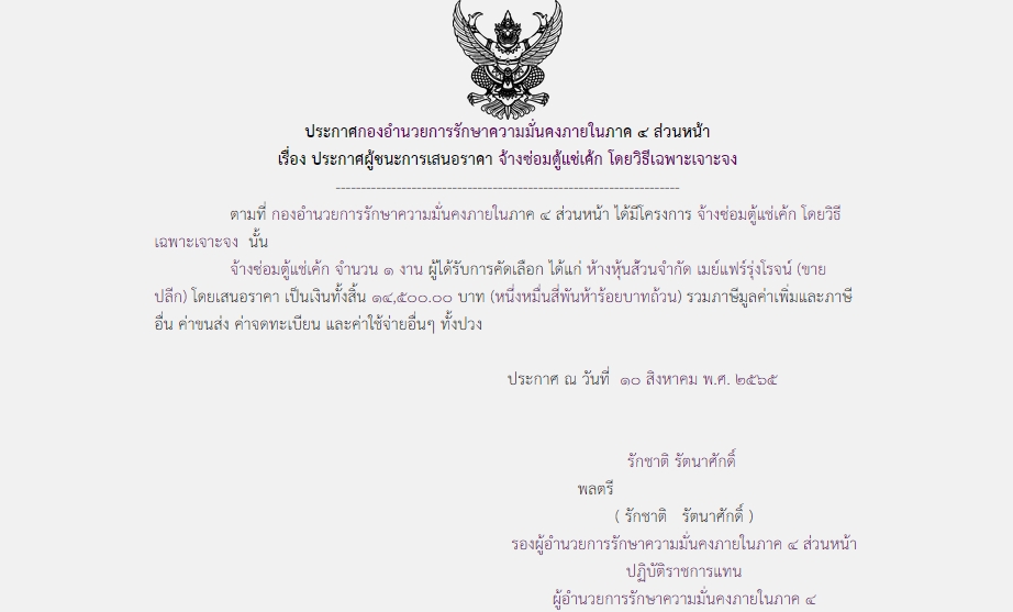 จัดซื้อ จัดจ้างประกาศผู้ชนะการเสนอราคา ประกาศผู้ชนะการเสนอราคา จ้างซ่อมตู้แช่เค้ก โดยวิธีเฉพาะเจาะจง August 22, 2022 533 Share Facebook Twitter Google+ Telegram LINE