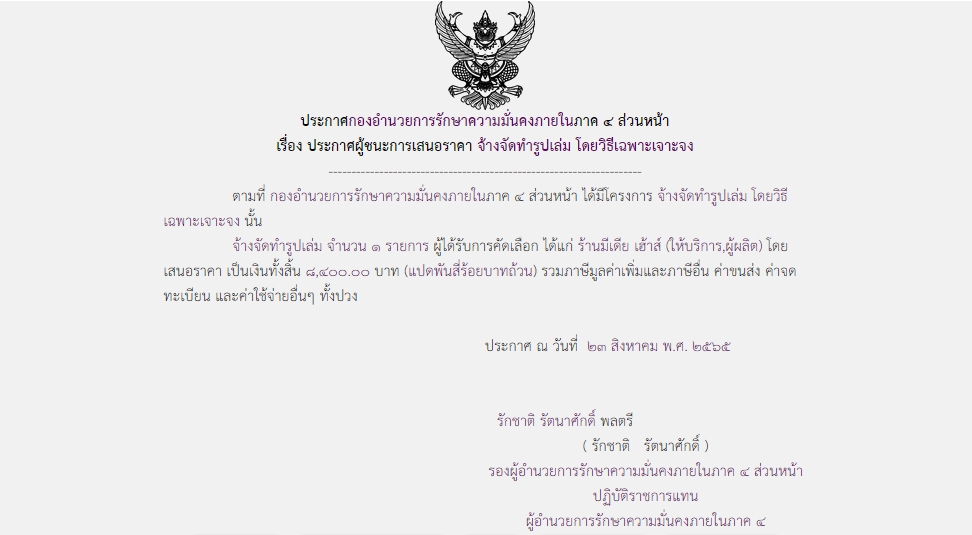 ประกาศผู้ชนะการเสนอราคา จ้างจัดทำรูปเล่ม โดยวิธีเฉพาะเจาะจง