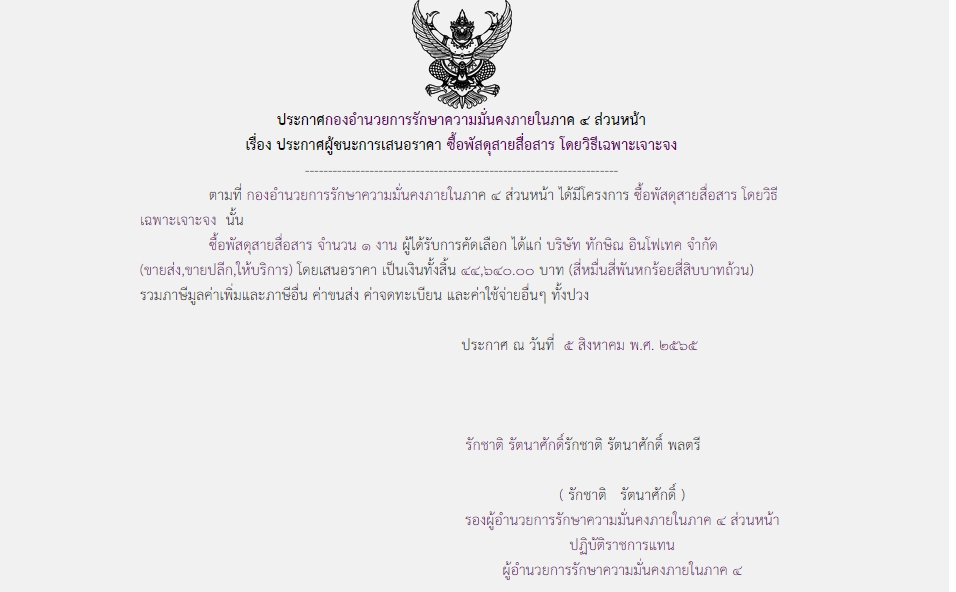 ประกาศผู้ชนะการเสนอราคา ซื้อพัสดุสายสื่อสาร โดยวิธีเฉพาะเจาะจง