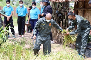 จากนั้นเดินทางเยี่ยมชมศูนย์เกษตรทฤษฎีใหม่ครบวงจร กองพลทหารรอบที่ 15 ซึ่งคณะรับชมการสาธิตการปฏิบัติของฐานเกษตรทฤษฎีใหม่ครบวงจร ตลอดจนร่วมกิจกรรมเกี่ยวข้าวพันธุ์ปทุมธานี 1 พระราชทาน ซึ่งเป็นแปลงนาที่น้อมนำศาสตร์พระราชา ตามแนวทางปรัชญาเศรษฐกิจพอเพียงมาลงมือปฏิบัติ โดยแปลงนาดังกล่าวใช้เป็นศูนย์การเรียนรู้เกี่ยวกับพันธุ์ข้าวพระราชทานให้กับกำลังพล ครอบครัวกำลังพล และชุมชนรอบค่าย ในการถ่ายทอดและเข้ามาศึกษาเรียนรู้ รวมถึงเพื่อน้อมนำศาสตร์พระราชา ตามแนวทางปรัชญาเศรษฐกิจพอเพียงของ พระบาทสมเด็จพระมหาภูมิพลอดุลยเดชมหาราช บรมนาถบพิตร รัชกาลที่ 9 มาเป็นแนวทางในการประพฤติปฏิบัติ ให้เกิดผลเป็นรูปธรรมในการดำเนินชีวิต ตลอดจนเพื่อเสริมสร้างความรัก ความสามัคคี และร่วมฟื้นฟู ประเพณี วัฒนธรรมของการทำอาชีพเกษตรกรรมดั้งเดิมไม่ให้สูญหายไปจากพื้นที่ ในบริบทสังคม พหุวัฒนธรรม
