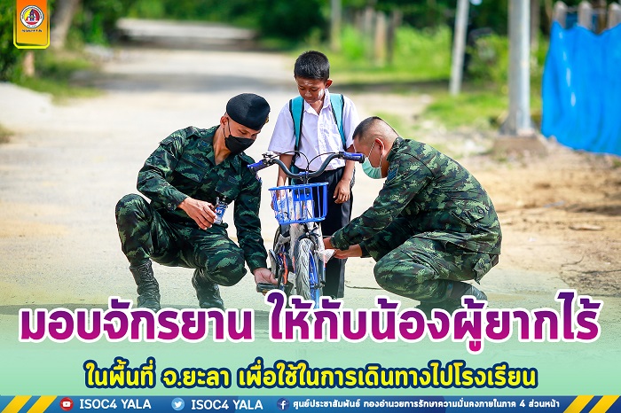 ฝ่ายกิจการพลเรือน หน่วยเฉพาะกิจยะลา มอบจักรยานให้ เด็กหญิงฟาดา สะระซอ และเด็กชายอาทิตย์ สะระซอ นักเรียนชั้นประถมศึกษาปีที่ 3 โรงเรียนบ้านอูเป๊าะ ตำบลวังพญา อำเภอรามัน จังหวัดยะลา โดยทั้ง 2 คน ได้เขียนจดหมายขอความช่วยเหลือมายัง หน่วยเฉพาะกิจยะลา มีความต้องการจักรยานในการเดินทางไปโรงเรียน ซึ่งปัจจุบันเดินเท้าไปโรงเรียน เนื่องจากทางบ้านมีฐานะที่ยากจน และครอบครัวไม่มีรายได้เลี้ยงชีพ บิดา-มารดา แยกทางกัน ทั้ง 2 คน อาศัยอยู่กับมารดา