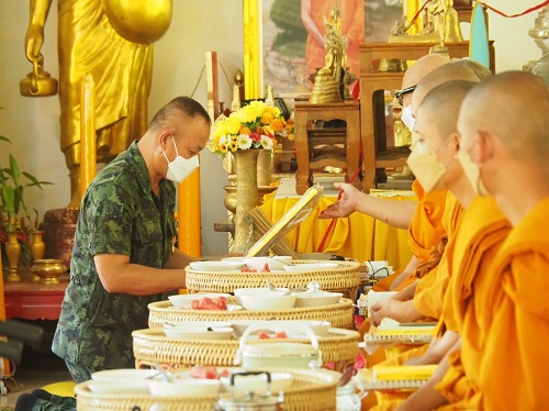 จากนั้น พลตรี ธนัช ฉิมพาลี ผู้บังคับหน่วยเฉพาะกิจยะลา พร้อมคณะฯ เดินทางลงพื้นที่กราบนมัสการ พร้อมทั้งถวายภัตตาหารเพลพระสงฆ์ที่อุปสมบทในโครงการอุปสมบทหมู่เฉลิมพระเกียรติ สมเด็จพระนางเจ้าสิริกิติ์ พระบรมราชินีนาถ พระบรมราชชนนีพันปีหลวง ประจำปี 2565 ณ วัดบ้านฉลองชัย ตำบลเขื่อนบางลาง อำเภอบันนังสตา จังหวัดยะลาโดยมี พันเอก ภูมิสิน สอนสุภาพ ผู้บังคับหน่วยเฉพาะกิจกรมทหารพรานที่ 30 ผู้นำท้องที่ ผู้นำท้องถิ่นให้การต้อนรับ โดยได้ถวายภัตตาหารและถวายปัจจัยแด่พระสงฆ์ที่จำนวน 6 รูป พร้อมทั้งสอบถามความเป็นอยู่และการปฏิบัติศาสนกิจในช่วงสถานการณ์แพร่ระบาดของเชื้อไวรัสโควิด19 รวมถึงสถานการณ์ความไม่สงบในพื้นที่ เพื่อรับทราบปัญหาและกำหนดแนวทางในการบรรเทาความเดือดร้อนของพระสงฆ์ที่อยู่ในพื้นที่ ไม่ละทิ้งวัดและสามารถปฏิบัติศาสนกิจได้ นอกจากนี้ ผู้บังคับหน่วยเฉพาะกิจยะลา ยังได้พบปะและแสดงความห่วงใย แก่พี่น้องชาวไทยพุทธในพื้นที่ในช่วงสถานการณ์การแพร่ระบาดของเชื้อไวรัสโควิด-19 อีกด้วย ทั้งนี้กิจกรรมดังกล่าวจัดขึ้นภายใต้มาตรการป้องกันการแพร่ระบาดของโรคติดเชื้อไวรัสโควิด19 อย่างเคร่งครัด