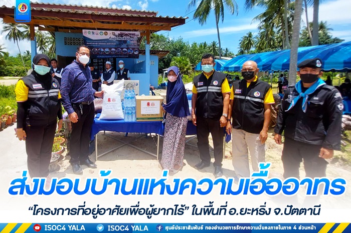 เมื่อวันที่ 1 กันยายน 2565 เวลา 1000 น. ณ บ้านเลขที่ 40/2 หมู่ที่ 2 ตำบลตันหยงดาลอ อำเภอยะหริ่ง จังหวัดปัตตานี พลตรี คมกฤช รัตนฉายา ผู้บังคับหน่วยเฉพาะกิจปัตตานี มอบหมายให้ฝ่ายสร้างความเข้าใจ หน่วยเฉพาะกิจปัตตานี ลงพื้นที่ร่วมกิจกรรมส่งมอบบ้านแห่งความเอื้ออาทร ในโครงการ “โครงการที่อยู่อาศัย เพื่อผู้ยากไร้” ให้แก่ครอบครัว นางสาวเจ๊ะรอกาหย๊ะ มะมิง ประชาชนผู้ได้รับความเดือดร้อนด้านที่พักอาศัย ซึ่งเป็นประชาชนผู้ยากไร้และปฏิบัติตนเป็นคนดีของสังคม ประกอบกับเป็นผู้มีจิตอาสา เสียสละ และเป็นที่รักของประชาชนในพื้นที่ ในการนี้ ฝ่ายสร้างความเข้าใจ หน่วยเฉพาะกิจปัตตานี ได้มอบเครื่องอุปโภคบริโภค สิ่งของเครื่องใช้ที่จำเป็นในการดำรงชีวิต อีกทั้งร่วมกับสถาบันพัฒนาฝีมือแรงงานปัตตานีที่ 23 ให้การสนับสนุนเยาวชนในเรื่องของการต่อระบบไฟฟ้าให้แก่ครอบครัวดังกล่าว ภายในพิธีส่งมอบบ้าน มีผู้แทนหน่วยงานราชการ ภาคเอกชน ผู้นำท้องที่ ผู้นำท้องถิ่น และประชาชนในพื้นที่ร่วมในพิธี โดยมี นายแพทย์อนันต์ชัย ไทยประทาน ประธานสภาเครือข่ายช่วยเหลือด้านมนุษยธรรม สำนักจุฬาราชมนตรี เป็นประธานในการส่งมอบบ้านดังกล่าว