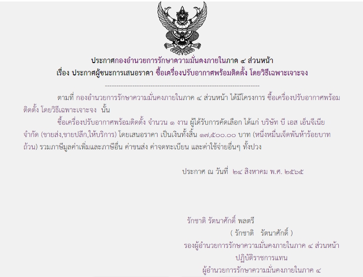 ประกาศผู้ชนะการเสนอราคา ซื้อเครื่องปรับอากาศพร้อมติดตั้ง โดยวิธีเฉพาะเจาะจง ( 17,500.00 บาท )