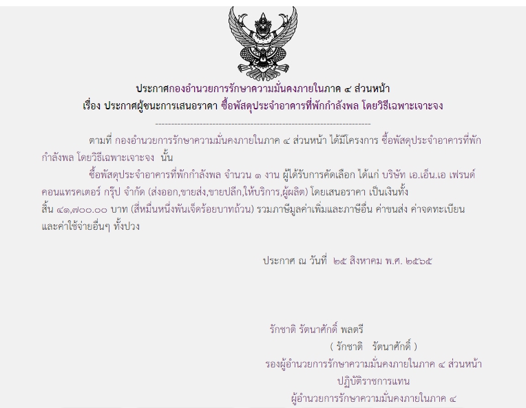 ประกาศผู้ชนะการเสนอราคา ซื้อพัสดุประจำอาคารที่พักกำลังพล โดยวิธีเฉพาะเจาะจง ( 41,700.00 บาท )