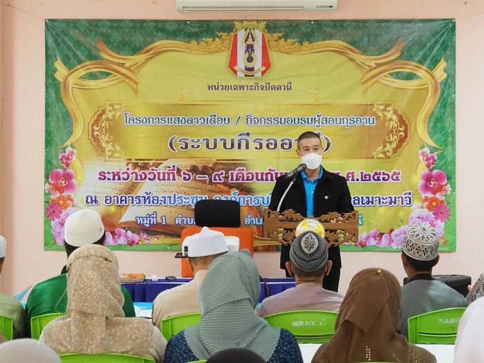 เมื่อวันที่ 6 กันยายน 2565 เวลา 08.30 น. ที่ห้องประชุม องค์การบริหารส่วนตำบลเมาะมาวี อำเภอยะรัง จังหวัดปัตตานี พันเอก พรชัย นิ่มทัศนศิริ รองเสนาธิการหน่วยเฉพาะกิจปัตตานี เป็นประธานเปิดกิจกรรม “โครงการแสงดาวเดือน/กิจกรรมอบรมผู้สอนกุรอาน” เพื่อเป็นผู้สอนกุรอานในระบบกีรออาตี เพื่อส่งเสริมสนับสนุนผู้สอนมีทักษะการอ่านอัลกรุอ่านตามแบบกีรออาตี ส่งเสริมพัฒนาศักยภาพและเพิ่มพูนความสามารถในการสอนอัลกรุอ่านให้แก่เยาวชน และประชาชนในพื้นที่อ่านอัลกรุอ่านได้อย่างถูกต้องตามหลักไวยกรณ์และสามารถเข้าใจถึงเนื้อหานำไปสู่การแปลและการตีความหมายที่ถูกต้องอย่างอย่างแท้จริง ป้องกันการเบือนคำสอนของศาสนาอิสลาม เสริมสร้างความรู้ของการอยู่ร่วมกันภายใต้สังคมพหุวัฒนธรรม ซึ่งเป็นอัตลักษณ์ท้องถิ่นของพื้นที่จังหวัดชายแดนภาคใต้ และเป็นการสร้างภาพลักษณ์ที่ดีต่อหน่วยงานภาครัฐ ที่พร้อมส่งเสริมทุกศาสนาอย่างเท่าเทียมกัน โดยมี รองผู้บังคับหน่วยเฉพาะกิจกรมทหารพรานที่ 20 นายกองค์การบริหารส่วนตำบลเมาะมาวี บาบอ ฮิบรอเฮง ฮะ และทีมคณะวิทยากร รวมถึงผู้นำศาสนา ผู้นำท้องที่ ผู้นำท้องถิ่น ร่วมในพิธี