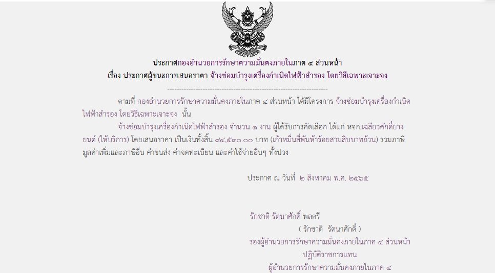 ประกาศผู้ชนะการเสนอราคา จ้างซ่อมบำรุงเครื่องกำเนิดไฟฟ้าสำรอง โดยวิธีเฉพาะเจาะจง ( 94,530.00 บาท )