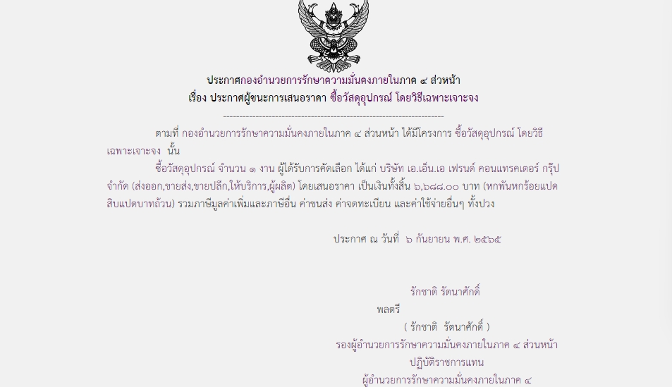 ประกาศผู้ชนะการเสนอราคา ซื้อวัสดุอุปกรณ์ โดยวิธีเฉพาะเจาะจง