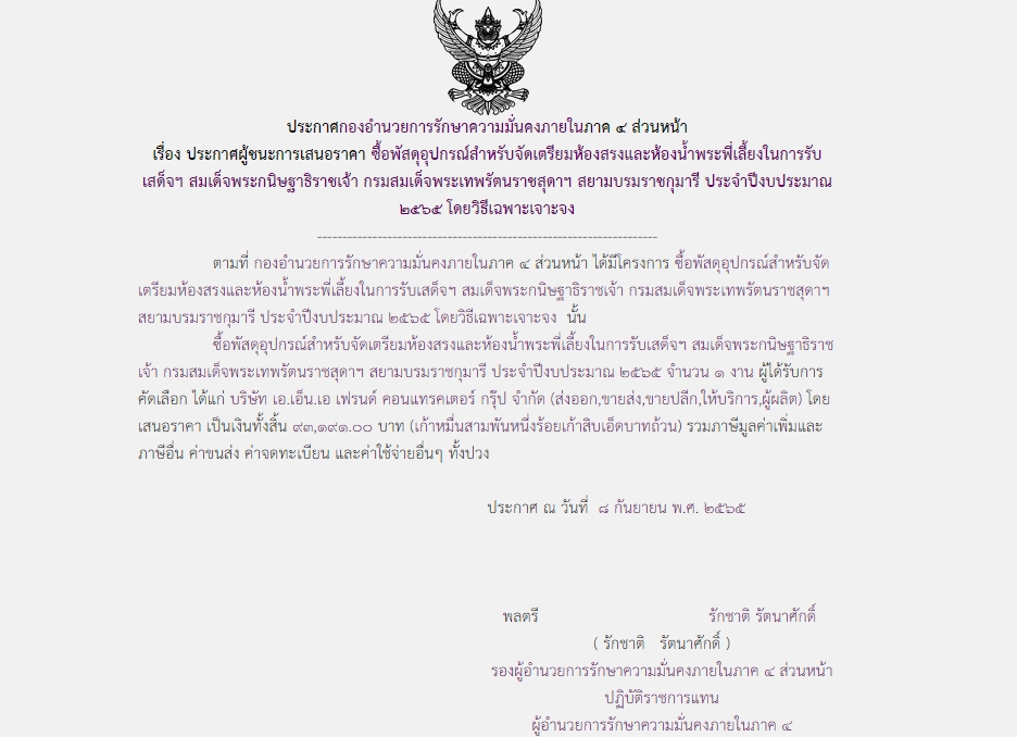 จัดซื้อ จัดจ้างประกาศผู้ชนะการเสนอราคา ประกาศผู้ชนะการเสนอราคา ซื้อพัสดุอุปกรณ์สำหรับจัดเตรียมห้องสรงและห้องน้ำพระพี่เลี้ยงในการรับเสด็จฯ สมเด็จพระกนิษฐาธิราชเจ้า กรมสมเด็จพระเทพรัตนราชสุดาฯ สยามบรมราชกุมารี ประจำปีงบประมาณ ๒๕๖๕ โดยวิธีเฉพาะเจาะจง September 15, 2022 655 Share Facebook Twitter Google+ Telegram LINE
