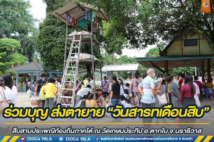 เมื่อวันที่ 25 กันยายน 2565 เวลา 09.30 น. วัดเกษมประทีป ตำบลเกาะสะท้อน อำเภอตากใบ จังหวัดนราธิวาส พลตรี เฉลิมพร ขำเขียว ผู้บัญชาการกองพลทหารราบที่ 15 / ผู้อำนวยการศูนย์ประสานงานโครงการอันเนื่องมาจากพระราชดำริ เดินลงพื้นที่ ร่วมทำบุญส่งตายาย “วันสารทเดือนสิบ” สืบสานประเพณีท้องถิ่นภาคใต้ ประจำปี 2565 ร่วมกับผู้นำชุมชน ผู้นำท้องถิ่น และพี่น้องประชาชนไทยพุทธในพื้นที่ เพื่อเป็นการอุทิศส่วนบุญ ส่วนกุศล ให้กับบรรพชน (ตา-ยาย) ที่ล่วงลับไปแล้ว เป็นการสืบสานประเพณีร่วมกันระหว่างเจ้าหน้าที่ทหารกับประชาชน โดยมี พันเอก ยุทธนา สายประเสริฐ ผู้บังคับการกรมทหารราบที่ 151 / หัวหน้าคณะทํางานโครงการอันเนื่องมาจากพระราชดําริ คณะที่ 3 ตลอดจนหัวหน้าส่วนราชการ ข้าราชการ ทหาร ตำรวจ เข้าร่วมกิจกรรม
