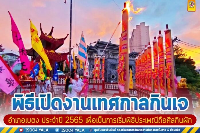 เมื่อวันที่ 25 กันยายน 2565 เวลา 18.00 น. ที่วัดโพธิสัตโตเจ้าแม่กวนอิมเบตง หรือวัดกวนอิม อำเภอเบตง จังหวัดยะลา พลเอก มณี จันทร์ทิพย์ ที่ปรึกษากองอำนวยการรักษาความมั่นคงภายในภาค 4 ส่วนหน้า เป็นประธานพิธีเปิดงานเทศกาลกินเจอำเภอเบตง ประจำปี 2565 และร่วมพิธีอัญเชิญไฟพระฤกษ์เข้าไปในศาลเจ้าแม่กวนอิม ณ แท่นบูชา เพื่ออัญเชิญองค์ศักดิ์สิทธิ์เข้าสู่โรงพิธีตามประเพณีจีนโบราณ พร้อมทั้งจะมีการจุดไฟตะเกียงน้ำมันมะพร้าว วางตามแท่นบูชาของเทพเจ้าต่างๆ เพื่อความเป็นสิริมงคล และถือเป็นการเริ่มงานพิธีถือศีลกินผักที่สมบูรณ์ โดยมี นายเอก ยังอภัย ณ สงขลา นายอำเภอเบตง / ผู้อำนวยการศูนย์ปฏิบัติการอำเภอเบตง พร้อมด้วย นางมุกดา ยังอภัย ณ สงขลา นายกกิ่งกาชาดอำเภอเบตง ร่วมในพิธี
