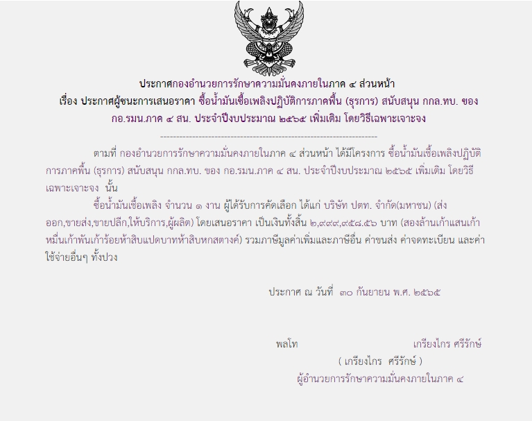 จัดซื้อ จัดจ้างประกาศผู้ชนะการเสนอราคา ประกาศผู้ชนะการเสนอราคา ซื้อน้ำมันเชื้อเพลิงปฎิบัติการภาคพื้น (ธุรการ) สนับสนุน กกล.ทบ. ของ กอ.รมน.ภาค ๔ สน. ประจำปีงบประมาณ ๒๕๖๕ เพิ่มเติม โดยวิธีเฉพาะเจาะจง September 30, 2022 483 Share Facebook Twitter Google+ Telegram LINE