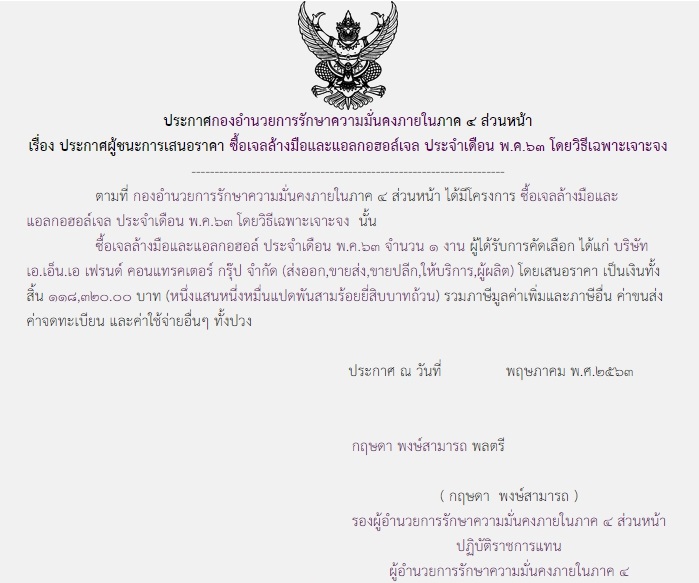 ประกาศผู้ชนะการเสนอราคา ซื้อเจลล้างมือและแอลกอฮอล์เจล ประจำเดือน พ.ค.63 โดยวิธีเฉพาะเจาะจง (118,320.00)