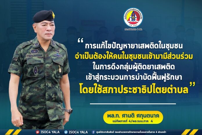 ประชาสัมพันธ์ข่าวประชาสัมพันธ์ “…การแก้ไขปัญหาการระบาดของยาเสพติดในชุมชน จำเป็นต้องให้คนในชุมชนเข้ามามีส่วนร่วมในการดึงกลุ่มผู้ติดยาเสพติดเข้าสู่กระบวนการบำบัดฟื้นฟูรักษา โดยใช้สภาประชาธิปไตยตำบลเป็นหลัก และแนวทางการบำบัด Camp 35 เชื่อมโยงกับกระบวนการชุมชนบำบัดยาเสพติด (CBTx) ควบคู่กันไปด้วย เพื่อให้กลุ่มผู้ติดยาเสพติดเหล่านี้ สามารถกลับไปใช้ชีวิตอยู่ในสังคมได้อย่างปกติสุข…” October 10, 2022 718 Share Facebook Twitter Google+ Telegram LINE พลโท ศานติ ศกุนตนาค แม่ทัพภาคที่ 4 / ผู้อำนวยการรักษาความมั่นคงภายในภาค 4 ศูนย์ประชาสัมพันธ์กองอำนวยการรักษาความมั่นคงภายในภาค4ส่วนหน้า