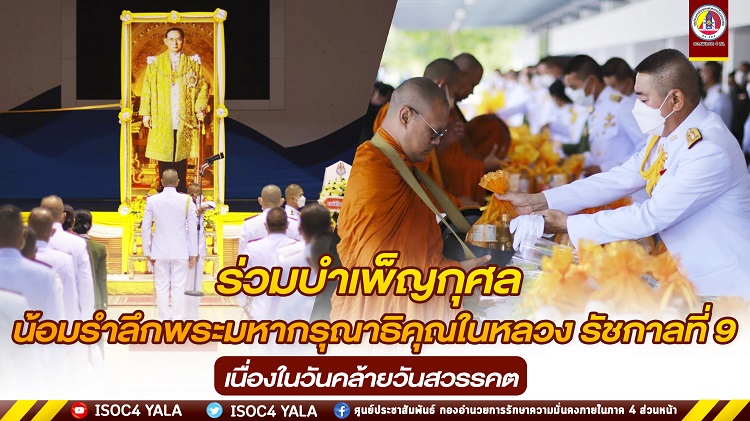 วันที่ 12 ตุลาคม 2565 ที่สโมสรรื่นฤดี ค่ายวชิราวุธ อำเภอเมือง จังหวัดนครศรีธรรมราช พลโท ศานติ ศกุนตนาค แม่ทัพภาคที่ 4 นำกำลังพลกองทัพภาคที่ 4 พร้อมหน่วยภายในค่ายวชิราวุธ ร่วมกันทำบุญตักบาตรข้าวสารอาหารแห้งพระภิกษุสงฆ์จำนวน 20 รูป ตั้งจิตอธิษฐานยืนสงบนิ่งเป็นเวลา 89 วินาที เนื่องในโอกาสวันคล้ายวันสวรรคตพระบาทสมเด็จพระบรมชนกาธิเบศร มหาภูมิพลอดุลยเดชมหาราช บรมนาถบพิตร ซึ่งตรงกับวันที่ 13 ตุลาคมพุทธศักราช 2565 เพื่อแสดงออกถึงความจงรักภักดี น้อมรำลึกถึงพระมหากรุณาธิคุณอันหาที่สุดมิได้