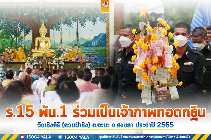 สำหรับพิธีทอดกฐินสามัคคีและทอดผ้าป่าในครั้งนี้ กองพันทหารราบที่ 1 กรมทหารราบที่ 15 ได้ดำเนินการสืบสานประเพณี และวัฒนธรรมอันดีงามของไทย ตามการแบ่งมอบการรณรงค์หาเจ้าภาพทอดกฐินและผ้าป่าให้กับวัด สำนักสงฆ์ และที่พักสงฆ์ ที่ยังไม่มีเจ้าภาพ ในพื้นที่ 3 จังหวัดชายแดนภาคใต้ และ 4 อำเภอของจังหวัดสงขลา ซึ่งรายได้จะนำไปเทพื้นคอนกรีตบริเวณรอบศาลาการเปรียญวัด เพื่อใช้เป็นพื้นที่ใช้สอย ในการทำกิจกรรมต่างๆ ให้เกิดความสะดวกสบายแก่พุทธศาสนิกชนต่อไป