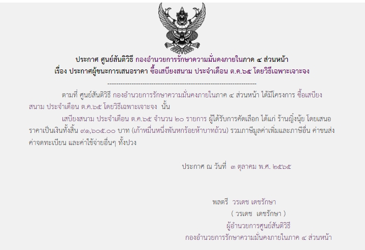 ประกาศผู้ชนะการเสนอราคา ซื้อเสบียงสนาม ประจำเดือน ต.ค.๖๕ โดยวิธีเฉพาะเจาะจง