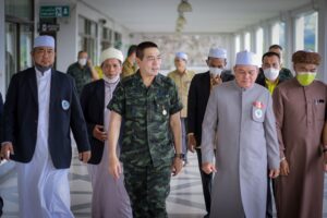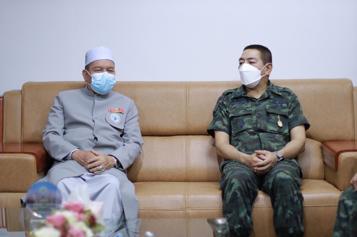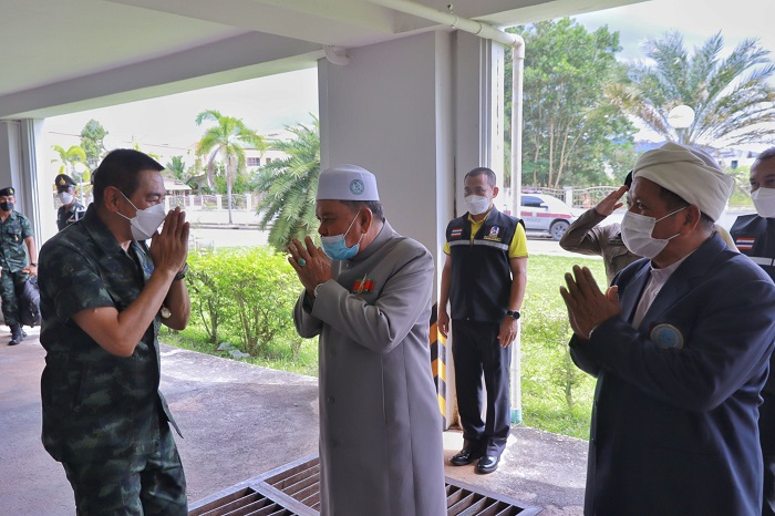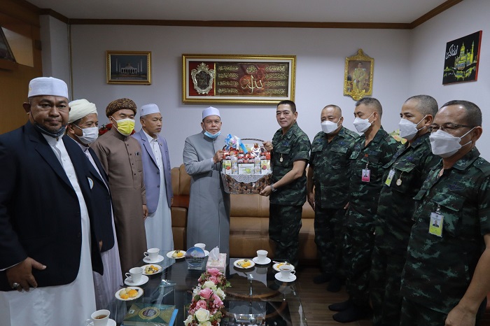 จากนั้น เวลา 13.30 น. แม่ทัพภาคที่ 4 พร้อมคณะเดินทางต่อไปยัง ศูนย์ประสานงานสำนักจุฬาราชมนตรี ประจำภาคใต้ มัสยิดกลางประจำจังหวัดสงขลา นำกระเช้าของขวัญเข้าพบปะเยี่ยมเยียนนายศักดิ์กรียา บิลแสละ ประธานกรรมการอิสลามประจำจังหวัดสงขลา และคณะ ร่วมกันคุยพูดหารือแลกเปลี่ยนนโยบายการแก้ปัญหาในพื้นที่จังหวัดชายแดนภาคใต้ ในโอกาสนี้แม่ทัพภาคที่ 4 ฝากแสดงความห่วงใยไปยังท่านจุฬาราชมนตรี ประธานคณะกรรมการกลางอิสลามแห่งประเทศไทย อีกด้วย
