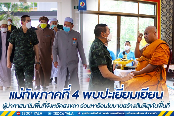 สำหรับการลงพื้นที่พบปะเยี่ยมเยียนผู้นำศาสนาในพื้นที่จังหวัดสงขลาในครั้งนี้ พลโท ศานติ ศกุนตนาค แม่ทัพภาคที่ 4 / ผู้อำนวยการรักษาความมั่นคงภายในภาค 4 ได้เน้นย้ำถึงแนวทางการแก้ไขปัญหายาเสพติด ทั้งในการป้องกัน ปราบปราม และการบำบัด ฟื้นฟู รักษา เพื่อไม่ให้เกิดความสูญเสีย โดยเฉพาะกลุ่มผู้ใช้ยาเสพติดที่เกิดอาการทางจิตเวช ซึ่งจะมีการดำเนินการผ่านสภาประชาธิปไตยตำบล เน้นการมีส่วนร่วมจากทุกภาคส่วน ทั้งภาครัฐ ภาคประชาชน สถาบันครอบครัว และผู้นำทางศาสนา เนื่องจากทราบปัญหาในพื้นที่เป็นอย่างดี ตลอดจนสถานการณ์อุทกภัยในพื้นที่ภาคใต้ ปัจจุบันกองทัพภาคที่ 4 ได้มีการเตรียมความพร้อมรับมือ โดยมีการจัดตั้งศูนย์บรรเทาสาธารภัยประจำแต่ละพื้นที่ และมีการซักซ้อมแผนเผชิญเหตุอย่างต่อเนื่อง เพื่อเตรียมความพร้อมของกำลังพลและยุทโธปกรณ์ ให้พร้อมช่วยเหลือพี่น้องประชาชนอย่างทันท่วงที ซึ่งการหารือถึงนโยบายและการดำเนินงานช่วยเหลือประชาชนในวันนี้ ผู้นำศาสนาได้ขานรับนโยบายและพร้อมให้การสนับสนุน เพื่อความสุขและความปลอดภัยของพี่น้องประชาชนในพื้นที่
