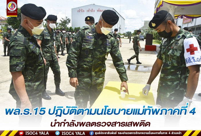 เมื่อวันที่ 20 ตุลาคม 2565 เวลา 1130 น. ที่ ลานพื้นที่หน้ากองพลทหารราบที่ 15 ค่ายสมเด็จพระสุริโยทัย ตำบลบ่อทอง อำเภอหนองจิก จังหวัดปัตตานี พลตรี เฉลิมพร ขำเขียว ผู้บัญชาการกองพลทหารราบที่ 15 นำกำลังพลปฎิบัติตามนโยบาย ของ พลโท ศานติ ศกุนตนาค แม่ทัพภาคที่ 4 / ผู้อำนวยการรักษาความมั่นคงภายในภาค 4 นำกำลังพลตรวจสารเสพติดในปัสสาวะ เพื่อคัดกรองกำลังพลที่มีความประพฤติที่ดี มาทำงานแก้ไขปัญหาในพื้นที่จังหวัดชายแดนภาคใต้ ตามยุทธศาสตร์คนดี เดินหน้าสานต่อนโยบายเร่งด่วน แก้ไขปัญหายาเสพติด เริ่มต้นจากบ้านตัวเอง สู่ชุมชน โดยมี พันเอก ณรงค์ ตันติสิทธิพร รองผู้บัญชาการกองพลทหารราบที่ 15 ฝ่ายอำนวยการ กองพลทหารราบที่ 15 และกำลังพลเข้าร่วมในกิจกรรมโดยพร้อมเพรียง