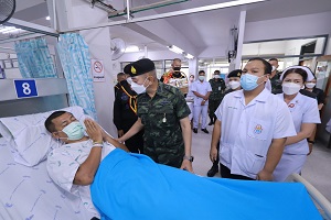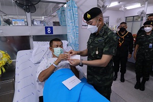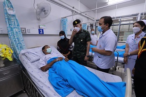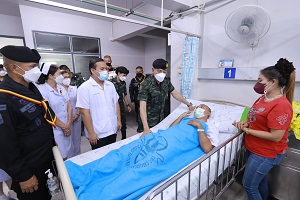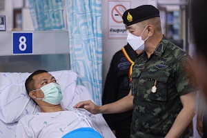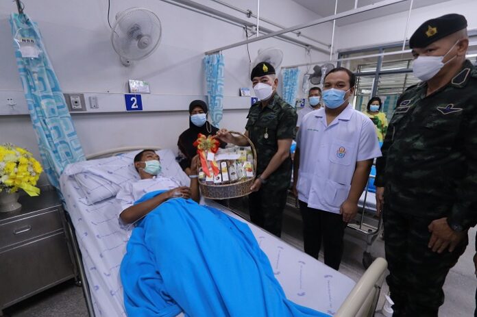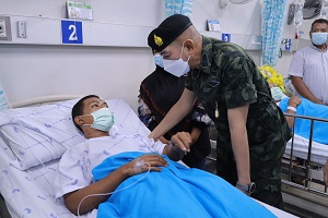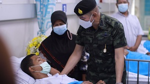โดย พลโท ศานติ ศกุนตนาค แม่ทัพภาคที่ 4 / ผู้อำนวยการรักษาความมั่นคงภายในภาค 4 ได้พูดคุย สอบถามอาการ และเหตุการณ์ที่เกิดขึ้น พร้อมทั้งนำความห่วงใย จาก พลเอก ณรงค์พันธ์ จิตต์แก้วแท้ ผู้บัญชาการทหารบกมายังกำลังพลหน่วยเฉพาะกิจกรมทหารพรานที่ 49 และครอบครัว กล่าวว่า “ขอขอบคุณ และชื่นชมที่ได้ทุ่มเท เสียสละในภารกิจอย่างสุดกำลังความสามารถ ดูจากแววตาและอาการของกำลังพลก็รู้ว่ามีกำลังใจสู้ต่อ เชื่อว่ากำลังพลทุกนายทำเพื่อพี่น้องประชาชน จากนี้ไปขอให้มีขวัญ และกำลังใจที่ดีกลับมาปฏิบัติหน้าที่ต่อไป” นอกจากนี้ยังได้กล่าวขอบคุณทีมแพทย์และพยาบาลที่ได้ดูแลกำลังพลอย่างเต็มที่ ก่อนมอบกระเช้าเยี่ยม และเงินช่วยเหลือเยียวยาเบื้องต้นให้กับกำลังพล กำชับหน่วยต้นสังกัดดูแลเรื่องสิทธิ และสวัสดิการโดยเร็ว