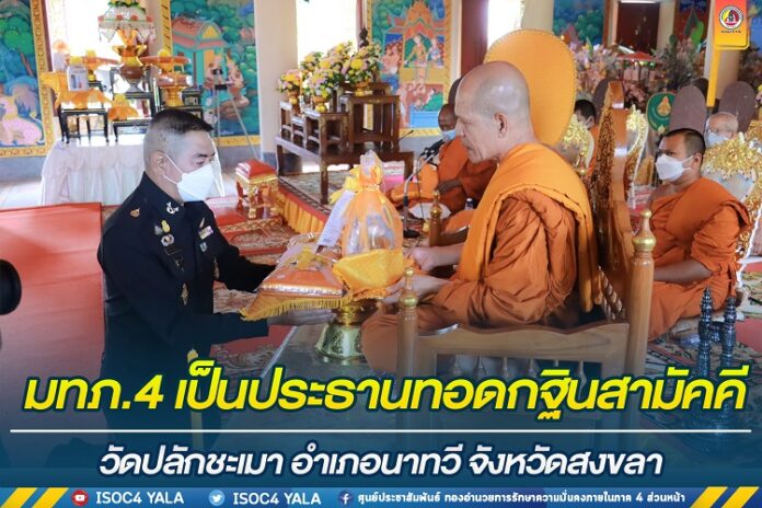 เมื่อวันที่ 30 ตุลาคม 2565 เวลา 13.09 น. ที่วัดปลักชะเมา ตำบลฉาง อำเภอนาทวี จังหวัดสงขลา พลโท ศานติ ศกุนตนาค แม่ทัพภาคที่ 4 / ผู้อำนวยการรักษาความมั่นคงภายในภาค 4 เป็นประธานในพิธีนำถวายผ้ากฐินสามัคคี จากนั้นพุทธศาสนิกชนในพื้นที่ร่วมกันถวายผ้ากฐินสามัคคี เพื่อร่วมกันอนุรักษ์สืบสานประเพณีวัฒนธรรมอันดีงาม ส่งเสริมความรักความสามัคคีของประชาชนในพื้นที่ และให้พระภิกษุสงฆ์ที่จำพรรษาครบถ้วนไตรมาสทั้ง 6 รูป ของวัดปลักชะเมาได้รับอานิสงฆ์กฐิน และนำไปสมทบทุนทำนุบำรุงพระพุทธศาสนาต่อไป โดยมี พระครูสุวัฒนาภรณ์ รองเจ้าคณะจังหวัดสงขลา เป็นประธานฝ่ายสงฆ์, ผู้บังคับหน่วยขึ้นตรงกองทัพภาคที่ 4 หัวหน้าส่วนราชการ และพุทธศาสนิกชนในพื้นที่ร่วมพิธีอย่างพร้อมเพรียง โดยปัจจัยที่ได้จากบริวารกฐินครั้งนี้มียอดรวมทั้งสิ้น 644,518 บาท