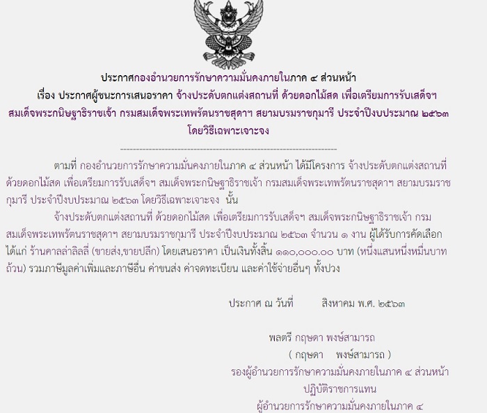 จัดซื้อ จัดจ้างประกาศผู้ชนะการเสนอราคา ประกาศผู้ชนะการเสนอราคา จ้างประดับตกแต่งสถานที่ ด้วยดอกไม้สด เพื่อเตรียมการรับเสด็จฯ สมเด็จพระกนิษฐาธิราชเจ้า กรมสมเด็จพระเทพรัตนราชสุดาฯ สยามบรมราชกุมารี ประจำปีงบประมาณ 2563 โดยวิธีเฉพาะเจาะจง (110,000.00) September 13, 2020 965 Share Facebook Twitter Google+ Telegram LINE สบป.กอ.รมน.ภาค 4 สน.