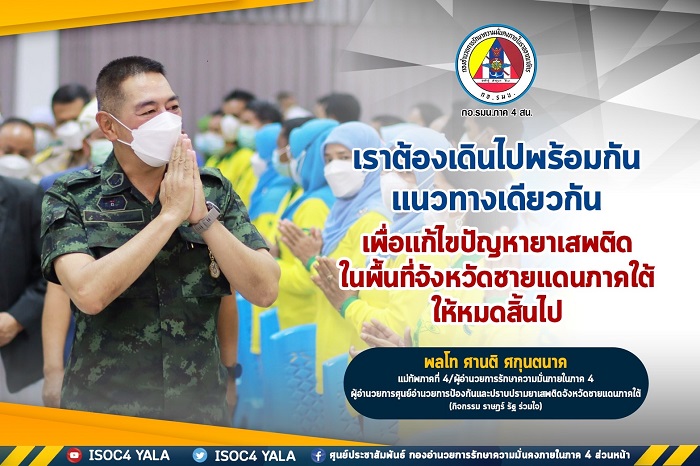 นโยบายการแก้ไขปัญหายาเสพติดของ พลโท ศานติ ศกุนตนาค แม่ทัพภาคที่ 4 / ผู้อำนวยการรักษาความมั่นคงภายในภาค 4 ในฐานะผู้อำนวยการศูนย์อำนวยการป้องกันและปราบปรามยาเสพติดจังหวัดชายแดนภาคใต้ ดำเนินการตามกลไกภายใต้ศูนย์อำนวยการป้องกันและปราบปรามยาเสพติดจังหวัดชายแดนภาคใต้ สอดคล้องกับกฎหมายยาเสพติดและแผนระดับชาติว่าด้วยการป้องกัน ปราบปราม และแก้ไขปัญหายาเสพติด ด้วยการผนึกกำลังบูรณาการการทำงานร่วมกัน ไม่ว่าจะเป็นประชาชน และเจ้าหน้าที่ของรัฐ ทั้งพลเรือน ตำรวจ ทหาร และทุกภาคส่วน “เราต้องเดินไปพร้อมกันและ แนวทางเดียวกัน” เพื่อแก้ไขปัญหายาเสพติดในพื้นที่จังหวัดชายแดนภาคใต้ให้หมดสิ้นไป