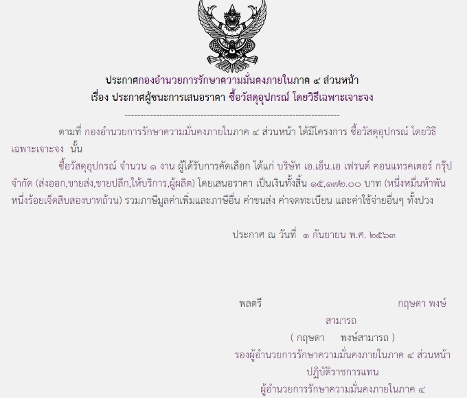 ประกาศผู้ชนะการเสนอราคา ซื้อวัสดุอุปกรณ์ โดยวิธีเฉพาะเจาะจง (15,172.00)