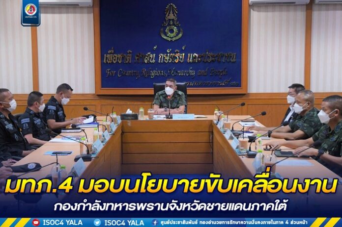 โดยแม่ทัพภาคที่ 4 ได้เน้นย้ำการปฏิบัติงานเชิงรุกให้คงประสิทธิภาพ ดำเนินงานตามยุทธศาสตร์การแก้ไขปัญหาพื้นที่จังหวัดชายแดนภาคใต้กำชับผู้บังคับหน่วยกำกับดูแลการปฏิบัติงานด้านการรักษาความปลอดภัยฐานปฏิบัติการ ทุกฐานต้องไม่เกิดเหตุ รวมถึงสถานการณ์ความรุนแรงต่างๆต้องไม่เกิดซ้ำเช่นกัน นำบทเรียนที่ผ่านมาวิเคราะห์ และปิดช่องว่างการก่อเหตุให้ได้ การออกไปปฏบัติงานทุกภารกิจให้หน่วยจัดชุดรักษาความปลอดภัยทุกครั้ง หน่วยต้องมีความพร้อมในการป้องกัน เพื่อลดการเกิดสูญเสียที่จะเกิดขึ้นได้ ในส่วนการบังคับใช้กฎหมายของหน่วยปฏิบัติการพิเศษร่วม และส่วนที่เกี่ยวข้องให้ยึดหลักการหลีกเลี่ยงการความรุนแรง ปฏิบัติตามขั้นตอนการบังคับใช้กฎหมายตามแนวทางสันติวิธี ประสานความร่วมมือกับผู้นำท้องที่ ผู้นำท้องถิ่น ผู้นำศาสนา สำหรับนโยบายการปราบปรามยาเสพติดให้หน่วยได้ยึดถือเป็นนโยบายเร่งด่วน ขับเครื่องโครงการบำบัดฟื้นฟูผู้ติดยาเสพติด โดยการมีส่วนร่วมของชุมชน ใช้ชุดเสริมสร้างความเข้าใจ ประชาสัมพันธ์ชี้แจงให้ประชาชนในพื้นที่ได้เข้าใจถึงปัญหายาเสพติดให้ทุกฝ่ายได้ร่วมมือกันในการแก้ไขปัญหายาเสพติดในพื้นที่ สิ่งสำคัญคือ กำลังพลทุกนายต้องไม่ยุ่งเกี่ยวกับยาเสพติด ต้องตรวจตรา กำกับดูแลอย่างสม่ำเสมอ รวมไปถึงต้องดูแลเรื่องสิทธิ สวัสดิการ และความเป็นอยู่ของกำลังพล ให้กำลังพลไม่เกิดความเครียด เพื่อให้การปฏิบัติงานประสบความสำเร็จอย่างเป็นรูปธรรม สันติสุขเกิดขึ้นในพื้นที่ ทั้งนี้ ในห้วงเทศกาลลอยกระทงที่จะมาถึงให้หน่วยในพื้นที่กำกับดูแลความปลอดภัยให้กับพี่น้องประชาชน ทำความเข้าใจและประชาสัมพันธ์ในกิจกรรมต่างๆ ข้อระเบียบ ข้อยกเว้น เช่นการจุดพลุ ประทัดโคมลอย การยิงปืนขึ้นฟ้า หน่วยจะต้องลงพื้นที่ตรวจสอบกำกับดูแลอย่างใกล้ชิดเพื่อให้เกิดความปลอดภัยแก่พี่น้องประชาชนในเทศกาลที่จะมาถึงนี้