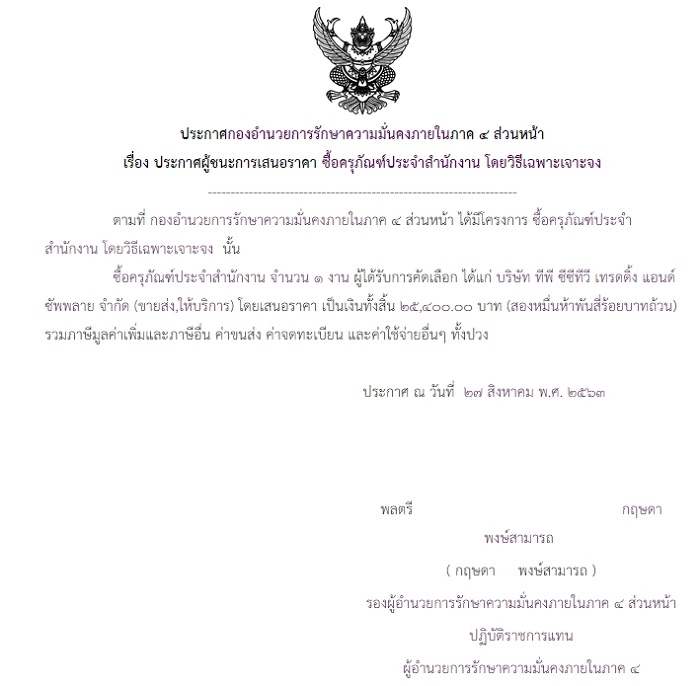 จัดซื้อ จัดจ้างประกาศผู้ชนะการเสนอราคา ประกาศผู้ชนะการเสนอราคา ซื้อครุภัณฑ์ประจำสำนักงาน โดยวิธีเฉพาะเจาะจง (25,400.00) September 13, 2020 979 Share Facebook Twitter Google+ Telegram LINE สบป.กอ.รมน.ภาค 4 สน.