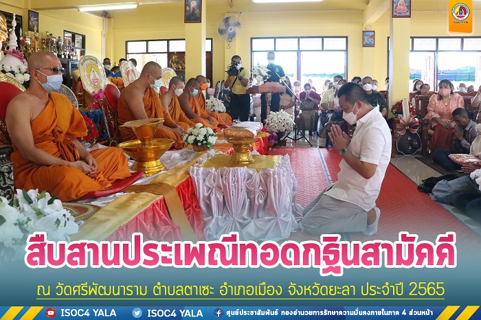 เมื่อวันที่ 5 พฤศจิกายน 2565 เวลา 11.00 น. ที่วัดศรีพัฒนาราม (วัดบ้านคล้า) ตำบลตาเซะ อำเภอเมือง จังหวัดยะลา พลตรี ไพศาล หนูสังข์ รองแม่ทัพภาคที่ 4 /รองผู้อำนวยการรักษาความมั่นคงภายในภาค 4 ส่วนหน้า เดินทางร่วมพิธีทอดกฐินสามัคคี โดยมี พลตำรวจโท อิทธิพล อัจฉริยะประดิษฐ์ ผู้บัญชาการสำนักงานพิสูจน์หลักฐานตำรวจ (เจ้าภาพหลัก) เป็นประธานในพิธี มีพระใบฎีกาธงไชย วิริโย เจ้าอาวาสวัดศรีพัฒนาราม เป็นประธานฝ่ายสงฆ์ พร้อมด้วย ดร.รัชดา ธนาดิเรก รองโฆษกประจำสำนักนายกรัฐมนตรี และกรรมการผู้แทนพิเศษของรัฐบาลในการแก้ปัญหาจังหวัดชายแดนภาคใต้ , นายสนั่น พงศ์อักษร ผู้ว่าราชการจังหวัดนราธิวาส , พันเอก รุ่งโรจน์ อนันตโท รองผู้อำนวยการรักษาความมั่นคงภายในจังหวัดยะลา (ฝ่ายทหาร) , หัวหน้าส่วนราชการ , เจ้าหน้าที่ตำรวจ , ทหาร , พุทธศาสนิกชนในพื้นที่และใกล้เคียงเข้าร่วมพิธีเป็นจำนวนมาก บรรยากาศเป็นไปอย่างคึกคัก ก่อนเริ่มพิธีได้มีการแห่ผ้ากฐิน รอบอุโบสถ 3 รอบ จากนั้นได้มีการประกอบพิธีถวายผ้ากฐิน พระสงฆ์อนุโมทนา โดยผู้มีจิตศรัทธาร่วมทำบุญทอดกฐินสามัคคีในครั้งนี้มียอดเงินที่ได้ จำนวน 6,286,266.88 บาท ซึ่งทางวัดจะได้นำเงินสมทบทุนบูรณปฏิสังขรณ์ศาสนสถานที่ชำรุดเสียหายและสร้างอุโบสถ ตลอดจนพัฒนาวัดต่อไป นอกจากนี้ ทางคณะเจ้าภาพฯ ยังได้มอบรถพยาบาลกู้ภัยมูลนิธิเจ้าแม่ทับทิม จำนวน 1 คัน