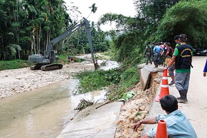 โอกาสนี้ พันโท ศุภฤกษ์ ชื่นจิต ผู้บังคับกองพันทหารช่างที่ 15 กองพลทหารราบที่ 15 เปิดเผยถึงแผนการดำเนินเร่งเข้าช่วยเหลือโดยนำรถโกยตักเข้าแต่งตลิ่งป้องกันกระแสน้ำซึ่งใช้ดินและหินจากอีกฝั่งปรับเปลี่ยนเส้นทางน้ำไม่ให้มีผลกระทบต่อถนน ปัจจุบันประชาชนสามารถสัญจรได้ 1 ช่องสัญจร ซึ่งนโยบายของผู้บัญชาการทหารบกได้ให้ใช้ศักยภาพในการนำกำลังพลและยุทโธปกรณ์เข้าให้ความช่วยเหลือประชาชน โดยกองทัพบกจะเป็นที่พึ่งแก่ประชาชนในทุกโอกาส รวมทั้ง นโยบายของพลโท ศานติ ศกุนตนาค แม่ทัพภาคที่ 4 ได้ให้นโยบายแก่กองทัพภาคที่ 4 ถึงการดำเนินการช่วยเหลือประชาชนอย่างรวดเร็วและทันท่วงทีโดยไม่ต้องรอสั่งการ ซึ่งวันนี้ กองพันทหารช่างที่ 15 กองพลทหารราบที่ 15 ภายใต้การนำของ พลตรี เฉลิมพร ขำเขียว ผู้บัญชาการกองพลทหารราบที่ 15 ได้ให้นำกำลังพลและยุทโธปกรณ์เข้าช่วยเหลือพี่น้องประชาชนจากผลกระทบน้ำป่าไหลหลากทำให้เกิดเส้นทางขาด ทั้งนี้ ต้องขอบคุณทุกส่วนราชการที่ได้ร่วมมือร่วมใจกันทำให้เกิดความสะดวกในการเข้าช่วยเหลือปรับพื้นที่และคาดว่าจะแล้วเสร็จในวันนี้เพื่อให้ประชาชนสามารถสัญจรไปมาได้อย่างปกติ