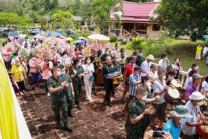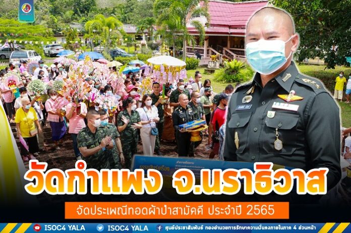 วันนี้ (6 พฤศจิกายน 2565) เวลา 12.30 น. ที่ วัดกำแพง หมู่ที่ 2 ตำบลกะลุวอ อำเภอเมือง จังหวัดนราธิวาส พันเอก เกียรติศักดิ์ ณีวงษ์ หัวหน้าศูนย์ประชาสัมพันธ์ กองอำนวยการรักษาความมั่นคงภายในภาค 4 ส่วนหน้า เป็นประธานฝ่ายฆราวาส ในพิธีทอดผ้าป่าสามัคคี โดยมีพระครูไพโรจน์ธรรมานุกูล เจ้าคณะตำบลลำภู เจ้าอาวาสวัดกำแพง เป็นประธานฝ่ายสงฆ์ พร้อมด้วยพระครูสุตธรรมโชติ ที่ปรึกษาเจ้าคณะอำเภอยี่งอ-บาเจาะ เจ้าอาวาสวัดพนาสณฑ์ , พระครูพิพัฒนบุญเขต เจ้าคณะอำเภอเมืองนราธิวาส เจ้าอาวาสวัดเขานาคา , หน่วยเฉพาะกิจนาวิกโยธิน กองทัพเรือ 33 และกำลังพลศูนย์ประชาสัมพันธ์ กองอำนวยการรักษาความมั่นคงภายในภาค 4 ส่วนหน้า ตลอดจนพุทธศาสนิกชนในพื้นที่และใกล้เคียง เข้าร่วมพิธีเป็นจำนวนมาก บรรยากาศเป็นไปอย่างคึกคัก ก่อนเริ่มพิธีได้มีการแห่ผ้าป่าสามัคคี รอบอุโบสถ 3 รอบ จากนั้นได้มีการประกอบพิธีถวายผ้าป่าสามัคคี พระสงฆ์อนุโมทนา โดยผู้มีจิตศรัทธาร่วมทำบุญทอดผ้าป่าสามัคคีในครั้งนี้มียอดเงิน จำนวนทั้งสิ้น 513,769 บาท