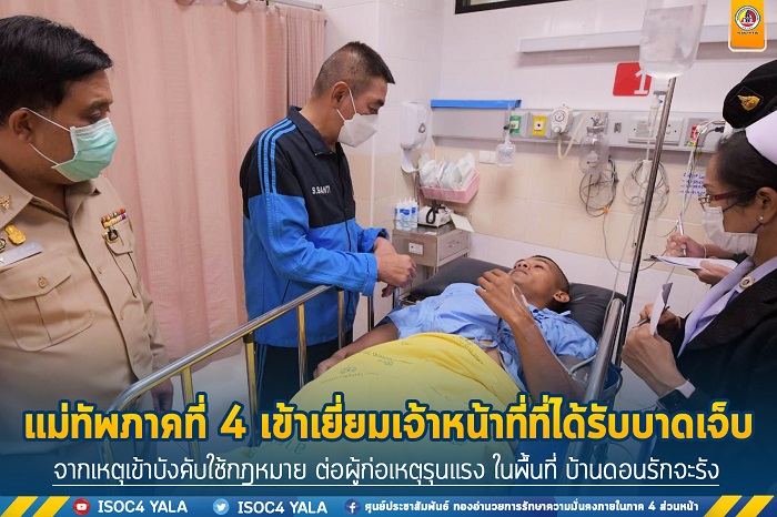 ภายหลังทราบเหตุการณ์ แม่ทัพภาคที่ 4 ได้ลงพื้นที่เยี่ยมผู้ได้รับบาดเจ็บ พูดคุยสอบถามอาการเบื้องต้น นำความห่วงใยจาก พลเอก ณรงค์พันธ์ จิตต์แก้วแท้ ผู้บัญชาการทหารบก มามอบแก่กำลังพล ทั้งนี้เหตุการณ์ที่เกิดขึ้น เนื่องด้วยเจ้าหน้าที่หน่วยงานความมั่นคงได้รับแจ้งจากชาวบ้านในพื้นที่พบคนร้ายซึ่งมีส่วนเกี่ยวข้องกับเหตุลอบวางระเบิดปั้มน้ำมันบางจาก เมื่อวันที่ 17 สิงหาคม 2565 ที่ผ่านมา ได้เข้ามาหลบซ่อนพักพิงในพื้นที่ดังกล่าว จึงได้ประสานกับส่วนที่เกี่ยวข้องเข้าบังคับใช้กฎหมาย และได้เชิญผู้นำท้องที่ ผู้นำท้องถิ่น ผู้นำศาสนามาเจรจา แต่การเจรจาไม่เป็นผล ทำให้เกิดการปะทะขึ้น จนทำให้เจ้าหน้าที่ตำรวจ (ชุดแดนไทย 54) ได้รับบาดเจ็บจำนวน 2 ราย คือ จ.ส.ต.อนุดล มะลิสุวรรณ โดนยิงที่แขนซ้าย และิส.ต.ต.เจษฏา ชนะวุฒิ อายุ 32 ปี โดนยิงหัวบ่าขวาทะลุ