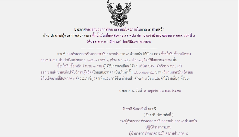 จัดซื้อ จัดจ้างประกาศผู้ชนะการเสนอราคา ประกาศผู้ชนะการเสนอราคา ซื้อน้ำมันเชื้อเพลิงของ สล.คปต.สน. ประจำปีงบประมาณ ๒๕๖๖ งวดที่ ๑ (ห้วง ต.ค.๖๕ – มี.ค.๖๖) โดยวิธีเฉพาะเจาะจง November 8, 2022 534 Share Facebook Twitter Google+ Telegram LINE
