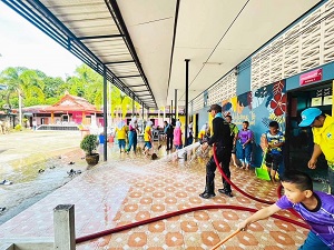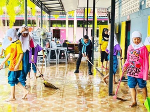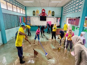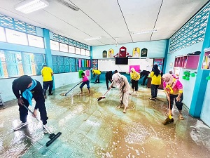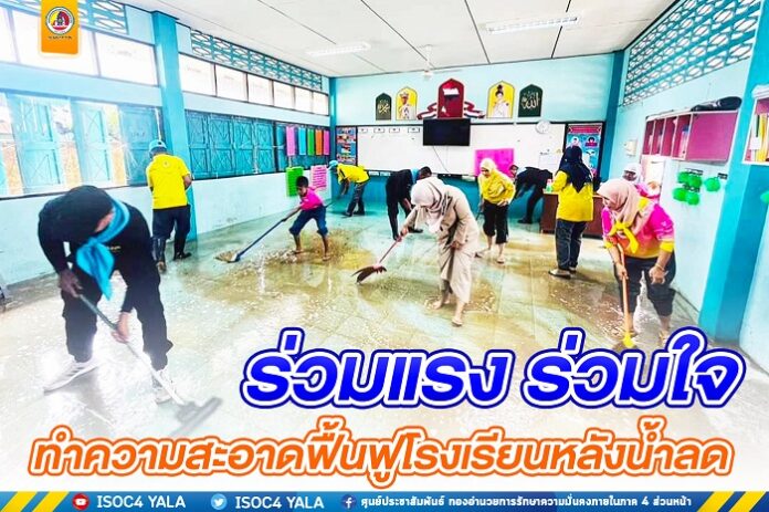 เมื่อวันที่ 14 พฤศจิกายน 2565 เวลา 08.30 น. ที่ โรงเรียนบ้านตราแด๊ะ หมู่ที่ 5 ตำบลบาโงสะโต อำเภอระแงะ จังหวัดนราธิวาส หน่วยเฉพาะกิจกรมทหารพรานที่ 45 นำกำลังพลชุดปฏิบัติการเสริมสร้างความเข้าใจ ร่วมกับ คณะครูโรงเรียนบ้านตราแด๊ะ พร้อมผู้นำหมู่บ้าน และคณะกรรมการโรงเรียน ฟื้นฟูพัฒนา ฉีด ล้าง ทำความสะอาด ห้องเรียน เขตสุขาภิบาล และล้างดินโคลน คราบน้ำบริเวณตัวอาคารเรียนต่างๆ ของพื้นที่โรงเรียนโดยรอบ หลังจากที่ได้รับผลกระทบจากอุทกภัยในห้วงที่ผ่านมา โดยได้รับการสนับสนุนรถบรรทุกน้ำ จาก องค์การบริหารส่วนตำบลบาโงสะโต เพื่อฉีดพ่นทำความสะอาด