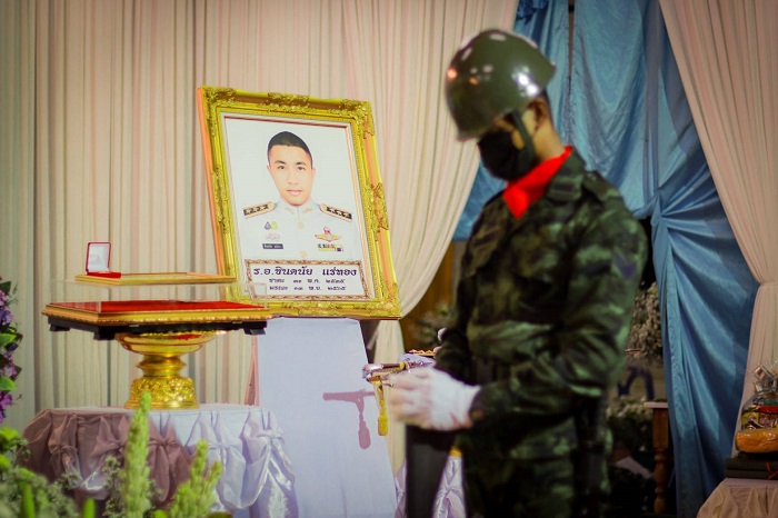 วันนี้ 16 พฤศจิกายน 2565 เวลา 17.30 น. ณ วัดนิคมประทีป ตำบลโคกหล่อ อำเภอเมือง จังหวัดตรัง พลโท ศานติ ศกุนตนาค แม่ทัพภาคที่ 4 / ผู้อำนวยการรักษาความมั่นคงภายในภาค 4 เป็นประธานในพิธีสวดพระอภิธรรมศพ ร้อยเอก ชินดนัย แร่ทอง นายทหารฝ่ายยุทธการและการฝึก กองพันทหารราบที่ 3 กรมทหารราบที่ 151 ซึ่งเสียชีวิตจากเหตุคนร้ายลอบวางระเบิด ชุดปฏิบัติการ หน่วยเฉพาะกิจนราธิวาส ขณะเดินทางเข้าสนับสนุน / ตรวจสอบพื้นที่เกิดเหตุลอบวางระเบิดและซุ่มยิงราษฎรหาของป่า ในพื้นที่ อำเภอจะแนะ จังหวัดนราธิวาส เมื่อวันที่ 13 พฤศจิกายน ที่ผ่านมา โดยมี พลเอก พรศักดิ์ พูลสวัสดิ์ กรรมการผู้แทนพิเศษของรัฐบาลฯ ด้านความมั่นคง พร้อมด้วยผู้บังคับบัญชาระดับสูง กำลังพลเพื่อนทหาร รวมไปถึงคณะญาติ และพี่น้องประชาชนในพื้นที่ เข้าร่วมพิธีสวดพระอภิธรรมในครั้งนี้