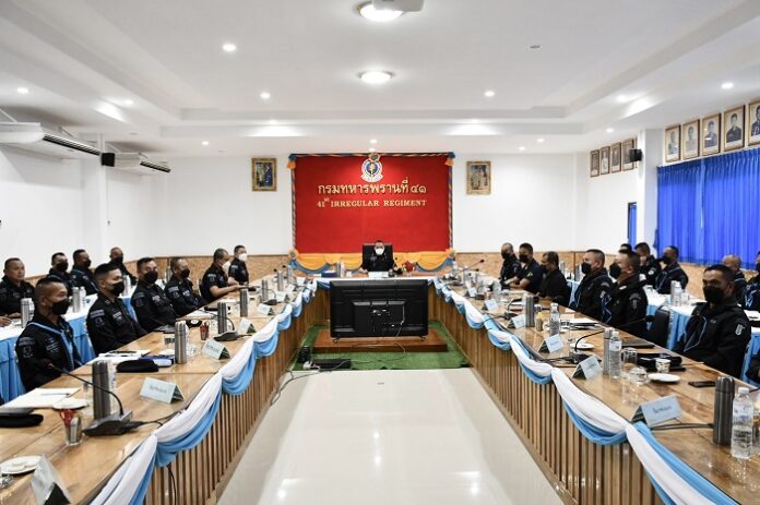 เมื่อวันที่ 21 พฤศจิกายน 2565 เวลา 10.00 น. ณ กองบังคับการหน่วยเฉพาะกิจกรมทหารพรานที่ 47 หมู่ที่ 5 ตำบลยะหา อำเภอยะหา จังหวัดยะลา พันเอก สฐิรพงษ์ อาจหาญ ผู้บังคับกองกำลังทหารพรานจังหวัดชายแดนภาคใต้ / ผู้บังคับหน่วยปฏิบัติการพิเศษร่วม พร้อมคณะ ลงพื้นที่ประชุมติดตามการปฏิบัติงาน ตลอดจนรับทราบปัญหาข้อขัดข้องของการดำเนินงานในห้วงที่ผ่าน พร้อมทั้งได้วางแผน และมอบนโยบายแนวทางในการปฏิบัติงานตามนโยบายของ ผู้อำนวยการรักษาความมั่นคงภายในภาค 4 เพื่อให้หน่วยสามารถปฏิบัติได้อย่างมีประสิทธิภาพมากที่สุด เน้นย้ำปรับแผนการปฏิบัติงานให้มีความรัดกุมมากยิ่งขึ้น เกิดข้อผิดพลาดน้อยที่สุด ต้องกำกับดูแลการปฏิบัติงานของกำลังพลทุกภารกิจอย่างใกล้ชิด โดยมี พันเอก สุรศักดิ์ ทั่วด้าว ผู้บังคับหน่วยเฉพาะกิจกรมทหารพรานที่ 47 / ผู้บังคับหน่วยปฏิบัติการพิเศษร่วม ประจำจังหวัดยะลา และส่วนที่เกี่ยวข้องร่วมประชุมอย่างพร้อมเพรียง