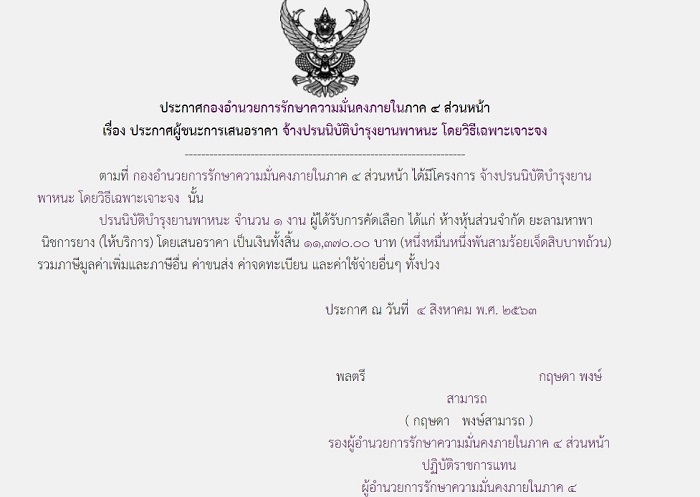 ประกาศผู้ชนะการเสนอราคา จ้างปรนนิบัติบำรุงยานพาหนะ โดยวิธีเฉพาะเจาะจง (11,370.00)