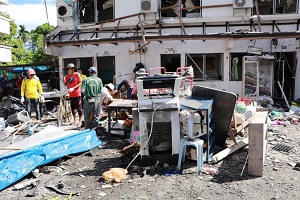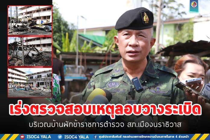 วันนี้ (23 พฤศจิกายน 2565) เวลา 10.00 น. พลตรี ปราโมทย์ พรหมอินทร์ รองแม่ทัพภาคที่ 4 / รองผู้อำนวยการรักษาความมั่นคงภายในภาค 4 ส่วนหน้า พร้อมคณะฯ เดินทางลงตรวจสอบพื้นที่เกิดเหตุคนร้ายลอบวางระเบิดบริเวณบ้านพักข้าราชการตำรวจ สถานีตำรวจภูธรเมืองนราธิวาส เมื่อวันที่ 22 พฤศจิกายน 2565 ที่ผ่านมา เป็นเหตุให้มีผู้เสียชีวิต 1 ราย คือ ร้อยตำรวจเอก สุทธิรักษ์ พันธนิยะ รองสารวัตรปราบปราม สถานีตำรวจภูธรเมืองนราธิวาส และมีผู้ได้รับบาดเจ็บจำนวน 37 ราย ซึ่งลักษณะการก่อเหตุของคนร้ายแต่งกายคล้ายเจ้าหน้าที่นอกเครื่องแบบ ขับรถยนต์ที่ประกอบระเบิดแสวงเครื่องบรรจุในถังแก๊สหุงต้มขนาด 15 กิโลกรัม รวมน้ำหนัก 80-100 กิโลกรัม บรรจุในรถยนต์คันก่อเหตุและขับเข้ามาพร้อมจุดชนวนตั้งเวลา 5 นาที และขณะนี้เจ้าหน้าเร่งสืบทราบหาเบาะแสจากรถยนต์ที่คนร้ายใช้ก่อเหตุคันดังกล่าว อยู่ในระหว่างการรวบรวมพยานหลักฐานเพื่อขยายผลเชื่อมโยงถึงตัวคนร้ายต่อไป