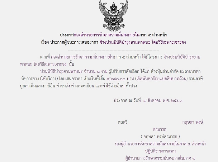 ประกาศผู้ชนะการเสนอราคา จ้างปรนนิบัติบำรุงยานพาหนะ โดยวิธีเฉพาะเจาะจง (7,680.00)