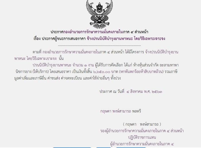 จัดซื้อ จัดจ้างประกาศผู้ชนะการเสนอราคา ประกาศผู้ชนะการเสนอราคา จ้างปรนนิบัติบำรุงยานพาหนะ โดยวิธีเฉพาะเจาะจง (6,650.00) September 14, 2020 1278 Share Facebook Twitter Google+ Telegram LINE สบป.กอ.รมน.ภาค 4 สน.
