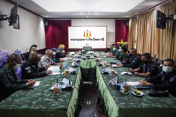 เมื่อวันที่ 30 พฤศจิกายน 2565 เวลา 13.30 น. ณ ห้องประชุมหน่วยเฉพาะกิจปัตตานี ค่ายอิงคยุทธบริหาร ตำบลบ่อทอง อำเภอหนองจิก จังหวัดปัตตานี พันเอก พรชัย นิ่มทัศนศิริ เสนาธิการหน่วยเฉพาะกิจปัตตานี เป็นประธานการประชุมเพื่อติดตามการขับเคลื่อนงานของกลุ่มมวลชนในพื้นที่จังหวัดปัตตานี ประจำเดือน พฤศจิกายน 2565 โดยเป็นการประชุมหารือร่วมกันระหว่าง ฝ่ายกิจการพลเรือน หน่วยเฉพาะกิจปัตตานี ผู้ช่วยหัวหน้าฝ่ายสร้างความใจฯ ผู้แทนหน่วยขึ้นตรงหน่วยเฉพาะกิจปัตตานี ร่วมกับ ประธานองค์กรภาคประชาชนเพื่อสันติและเศรษฐกิจพอเพียง จังหวัดปัตตานี ประธานกลุ่มทำดีมีอาชีพ ประธานกลุ่มสตรีผู้ได้รับผลกระทบฯ ประธานกลุ่มมวลชนญาลันนันบารู และประธานโฆษกชาวบ้าน