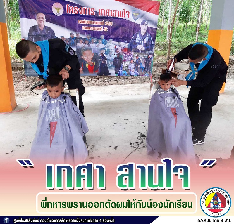 นอกจากนี้ หน่วยเฉพาะกิจกรมทหารพรานที่ 42 ยังได้นำช่างตัดผมของหน่วย ออกให้บริการตัดผมเคลื่อนที่ให้กับเด็กนักเรียน “ตามโครงการเกศาสานใจ ต้านภัยโควิด” เพื่อเป็นการลดค่าใช้จ่ายให้กับผู้ปกครอง ซึ่งสร้างความสุข และสร้างรอยยิ้มให้กับคณะครู และนักเรียน ตลอดจนยังเป็นการพัฒนาเสริมสร้างความสัมพันธ์อันดี สร้างภาพลักษณ์ที่ดีของหน่วยอีกด้วย