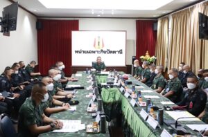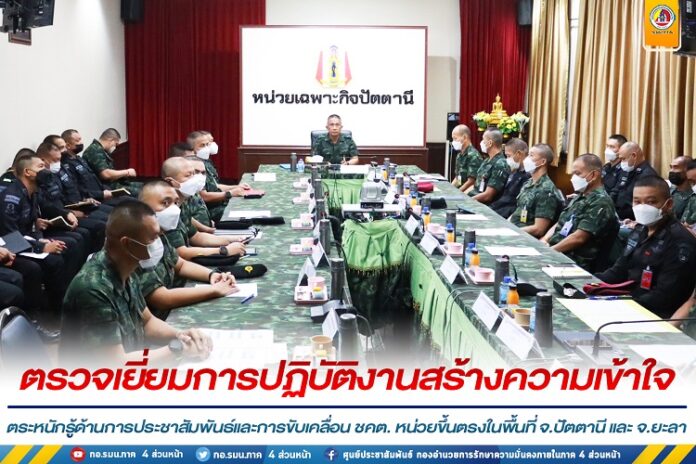 เมื่อวันที่ (9 ธันวาคม 2565) เวลา 09.30 น. ที่ห้องประชุมหน่วยเฉพาะกิจปัตตานี ค่ายอิงคยุทธบริหาร อำเภอหนองจิก จังหวัดปัตตานี พลตรี ปราโมทย์ พรหมอินทร์ รองแม่ทัพภาคที่ 4 / รองผู้อำนวยการรักษาความมั่นคงภายในภาค 4 ส่วนหน้า และคณะฝ่ายอำนวยการฯ ลงพื้นที่ตรวจเยี่ยมหน่วยขึ้นตรงกองอำนวยการรักษาความมั่นคงภายในภาค 4 ส่วนหน้า ในพื้นที่จังหวัดปัตตานี เพื่อติดตามการปฏิบัติงานเสริมสร้างความเข้าใจ การสร้างความตระหนักรู้ด้านการประชาสัมพันธ์ การขับเคลื่อนหน่วยชุดคุ้มครองตำบลและสนับสนุนแผนเสริมสร้างสันติสุขจังหวัดชายแดนภาคใต้ ประจำปี 2566 ให้เกิดประสิทธิภาพสูงสุด เพื่อตอบสนองนโยบายการเสริมสร้างสันติสุขของผู้อำนวยการรักษาความมั่นคงภายในภาค 4 โดยมี เจ้าหน้าที่หน่วยเฉพาะกิจปัตตานี, หน่วยเฉพาะกิจสันติสุข, กองกำลังทหารพรานจังหวัดชายแดนภาคใต้, กองอำนวยการรักษาความมั่นคงภายในจังหวัดปัตตานี และหน่วยเฉพาะกิจกรมทหารพรานในพื้นที่ ให้การต้อนรับและร่วมประชุม
