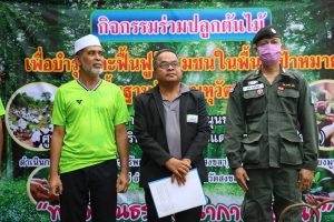 นายก้องสกุล จันทราช ผู้ช่วยเลขาธิการ ศอ.บต. กล่าวขอบคุณพี่น้องประชาชนและเจ้าหน้าที่ทุกคนที่ร่วมในกิจกรรมในครั้งนี้ว่า ในนาม ศอ.บต. ได้กำหนดทิศทางการแก้ไขปัญหาและพัฒนาจังหวัดชายแดนภาคใต้ โดยให้ความสำคัญจากเศรษฐกิจฐานรากบนพื้นฐานของการอนุรักษ์ทรัพยากรธรรมชาติและสิ่งแวดล้อมเป็นอันดับแรก เพราะเล็งเห็นว่าราษฎรในพื้นที่มีวิถีชีวิตและความถนัดในการดำรงชีพ โดยเกี่ยวข้องและสัมพันธ์กับทรัพยากรธรรมชาติและสิ่งแวดล้อมรอบตัวอยู่เป็นทุนเดิม ซึ่งสอดคล้องกับประเด็นยุทธศาสตร์ของ ศอ.บต. จึงต้องขอขอบคุณ พี่น้องประชาชนทุกคน ที่ให้ความสำคัญถึงการดูแลป่าไม้ โดยเฉพาะป่าในชุมชนบ้านเกิดของเราเอง เพื่อให้ต้นไม้สามารถเติบโตเพื่อให้ลูกหลานของเราได้รู้ถึงความสำคัญในการอนุรักษ์ผืนป่าไม้คงอยู่กับพื้นที่ และประเทศไทยต่อไป